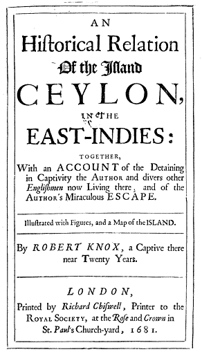 During the voyage Knox wrote the manuscript of An Historical Relation of the Island Ceylon, an account of his experiences in Ceylon, which was published in 1,681. The book was accompanied by engravings showing the inhabitants, their customs and agricultural techniques.