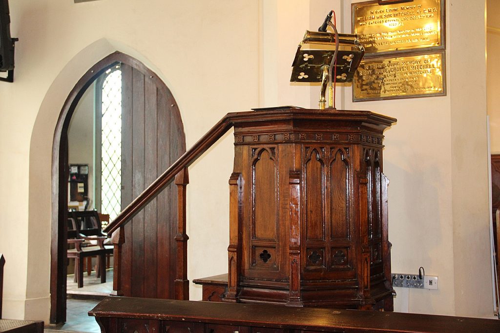 The church nestles on a lush green lawn. As you enter from the side door the first view that overpowers your senses is the massive stained glass window at the rear. The rose window with eight radiating bars is a wonderful work of art. The East window shows Jesus Christ, and below him are the Roman soldiers. The archangels Michael and Gabriel stand in reverence. John the Baptist, some monks and a Bishop are seen gazing up looking at the perceived New Jerusalem.